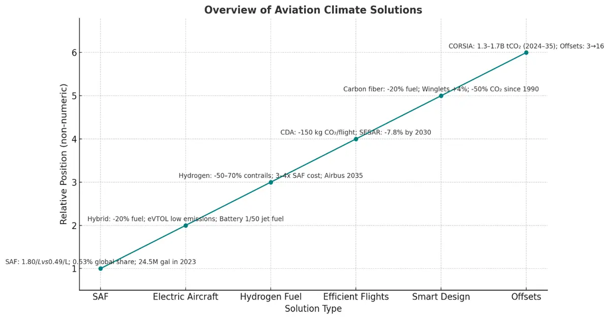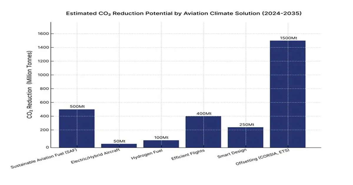 While the industry transitions to cleaner technology, many airlines are depending on carbon offsetting to control their emissions. By offsetting, they invest in green initiatives such as renewable energy farms, forest conservation, or carbon trapping facilities, that remove or avoid an equal amount of CO₂ elsewhere. An important initiative in this space is the Carbon Offsetting and Reduction Scheme for International Aviation (CORSIA), run by the International Civil Aviation Organization (ICAO). ORSIA is expected to achieve 1.3–1.7 billion tonnes of CO₂ reductions between 2024 and 2035. Offset credit costs vary, averaging $3.08 per tCO₂e in 2021, with projections of $14–16 per tonne by 2027. Offsetting is an efficient short-term tool to evade excessive pollution. Critics argue that it doesn’t help in direct emission reductions and may not always deliver the environmental benefits promised. That’s why it must be seen as part of a broader strategy that includes investing in long-term change.