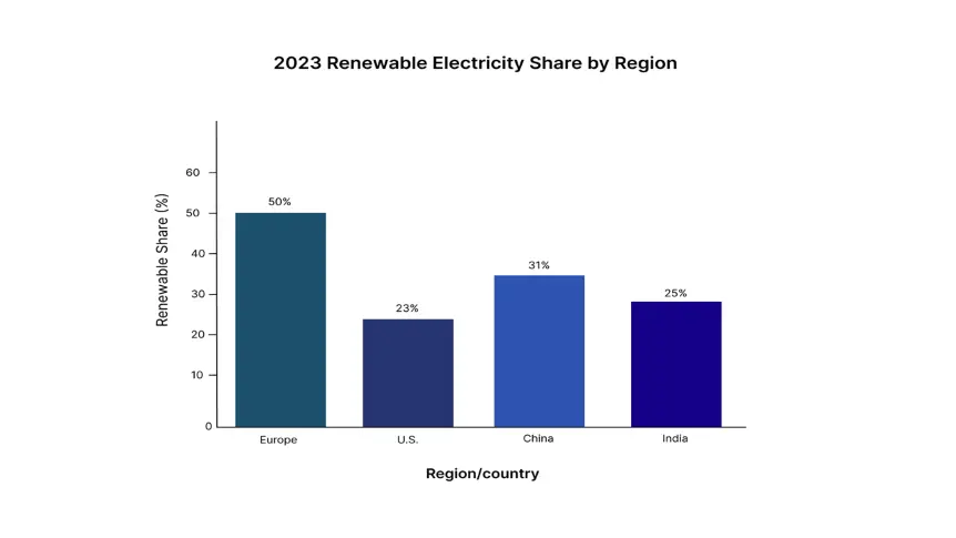 - Europe: Europe leads the global energy transition, driven by progressive climate legislation, ambitious renewable energy targets, and strong public support for sustainable development. The European Green Deal, introduced in December 2019, sets a legally binding goal of achieving net-zero greenhouse gas emissions by 2050. The intermediate target is to reduce emissions by at least 55% by 2030, compared to 1990 levels. According to the European Environment Agency (EEA), as of 2023, renewables contributed 50.5% of the European Union's electricity generation. Wind (17.5%) and solar (8.5%) are leading the charge.
