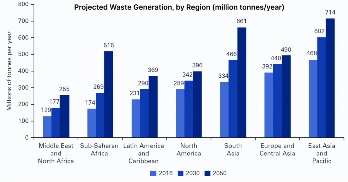 Global waste production is projected to reach 3.4 billion tons by 2050, up from 2.01 billion tons in 2016, according to the World Bank. At the same time, more than 1.6 billion tons of CO₂-equivalent greenhouse gases are emitted annually from poorly managed landfills. According to the same report, the daily per capita waste generation in high-income countries is expected to rise by almost 19 percent by 2050, compared to low- and middle-income countries, where it is expected to increase by approximately 38% or more.