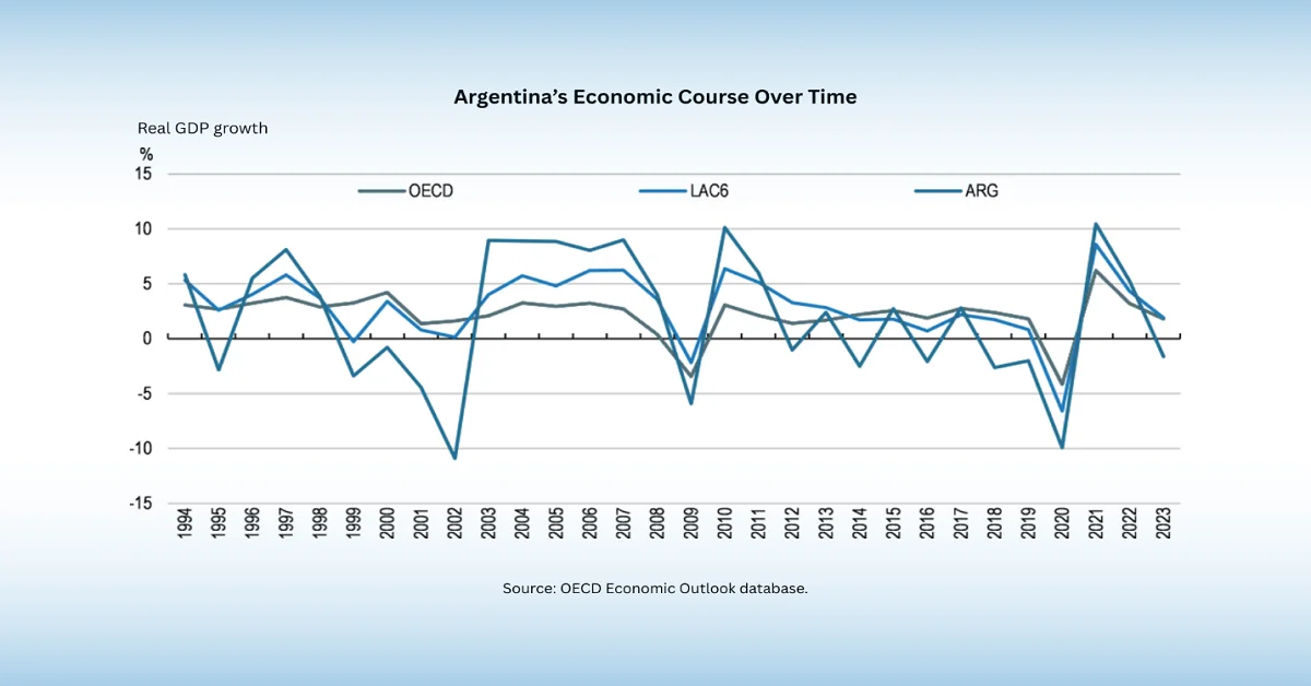 阿根廷经济历史动荡,经历了多次繁荣与衰退周期,财政状况恶化导致经济再次不稳定,通货膨胀率自2023年起飙升200%。此外,2024年大部分时间财政盈余,基本财政盈余达到GDP的1.8%,与2023年2.9%的赤字相比,实现了显著逆转。而且,总体财政收支平衡也达到了GDP的0.3%,较2023年提高了4.9个百分点。