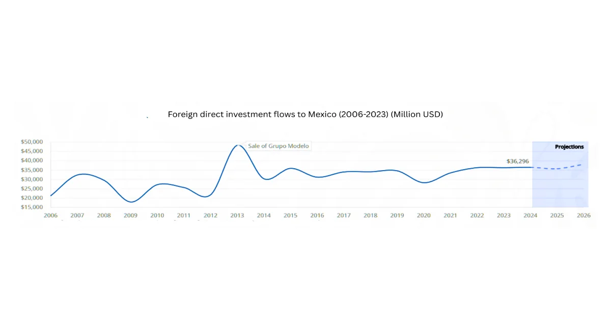 墨西哥是美国第二大商品和服务出口国,也是最重要的投资伙伴之一。美国是墨西哥最大的外国直接投资(FDI)来源国,截至2023年,FDI存量达2838亿美元。预计到2024年,墨西哥对美国的出口额将比2023年增长6.4%。同时,通货膨胀率也趋于温和,预计2024年将达到4.2%,略高于墨西哥中央银行(Banxico)设定的2%至4%的目标区间。此外,政府2025年的预算目标是将财政赤字从2024年占GDP的5.9%降至2025年的3.9%。此外,2024年10月,总统签署了一项意义重大的宪法法令,将包括墨西哥国家石油公司(Pemex)和墨西哥联邦电力公司(CFE)在内的国有能源组织重新定义为公共企业,以便为它们在国家能源领域提供统一待遇。