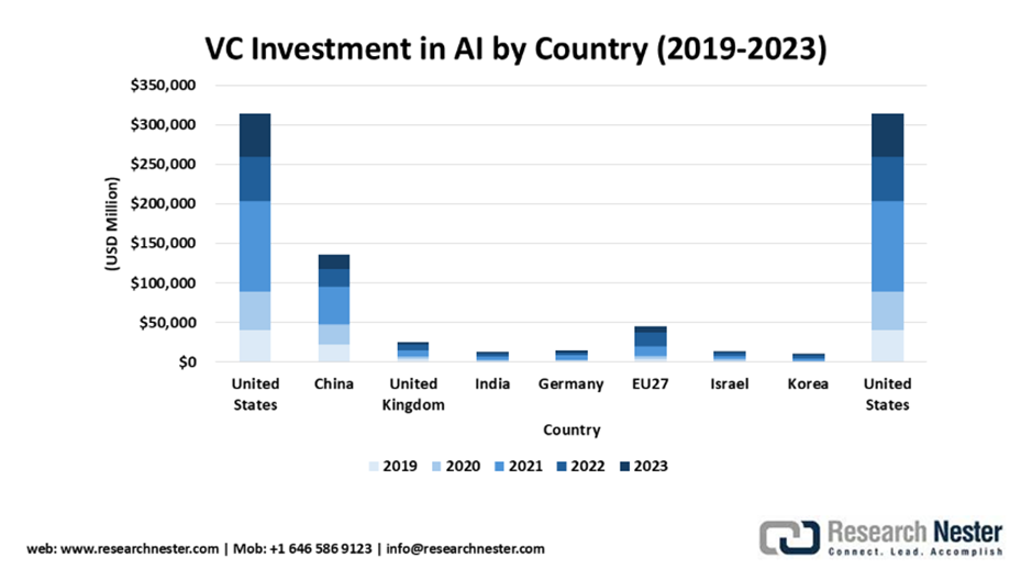 AIベンチャーキャピタル投資をリードするのは米国と中国で、特に米国は2021年に1,140億ドルを超え、企業および消費者向けインテリジェントアプリのイノベーションを牽引しています。EU27カ国と英国は、AI規制とスケーラブルなSaaSソリューションへの関心の高まりを反映し、大幅な成長を示しています。インドやドイツなどの新興ハブでは、フィンテック、ヘルスケア、産業オートメーション分野におけるAI活用アプリケーションの世界的な拡大が顕著であり、分野横断的なインテリジェントアプリ開発が促進されています。