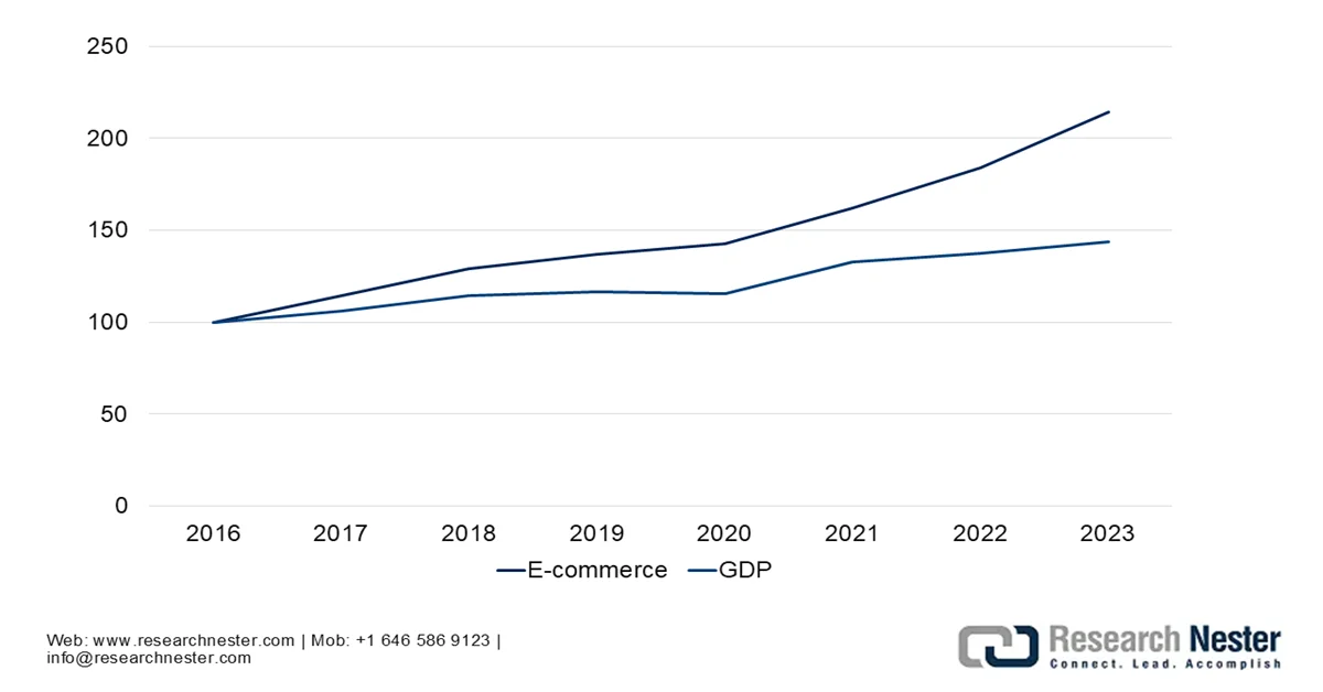 Growth of Business E-Commerce Sales vs. Global GDP (2016-2023)