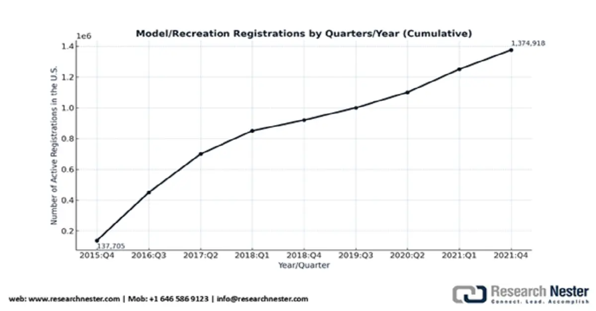 According to the Federal Aviation Administration (FAA), the total drones registered in the U.S. was 822,039 as of July 2025, of which 433,407 were commercial drones and 460,375 were certified remote drones. The FAA 2021 report mentioned that the recreational small drone market grew by 4.6% from 2020 to 2021. The 2021 new registration projections overshot by about 80,000 registrations, and the forecast of recreational small UAVs undershot by 5.06% for 2021 (i.e., 1.5822 million final aircraft data vs 1.5022 million predictions). By the end of December 2021, 1.37 million new recreational UAS owners and registered an average of 10,300 new registrations per month. Considering the total net gain/loss calculations, the effective/active fleet is calculated to be approximately 607,177 in December 2021. This renders the lower bound of the effective/active fleet of NAS recreational small drones.
