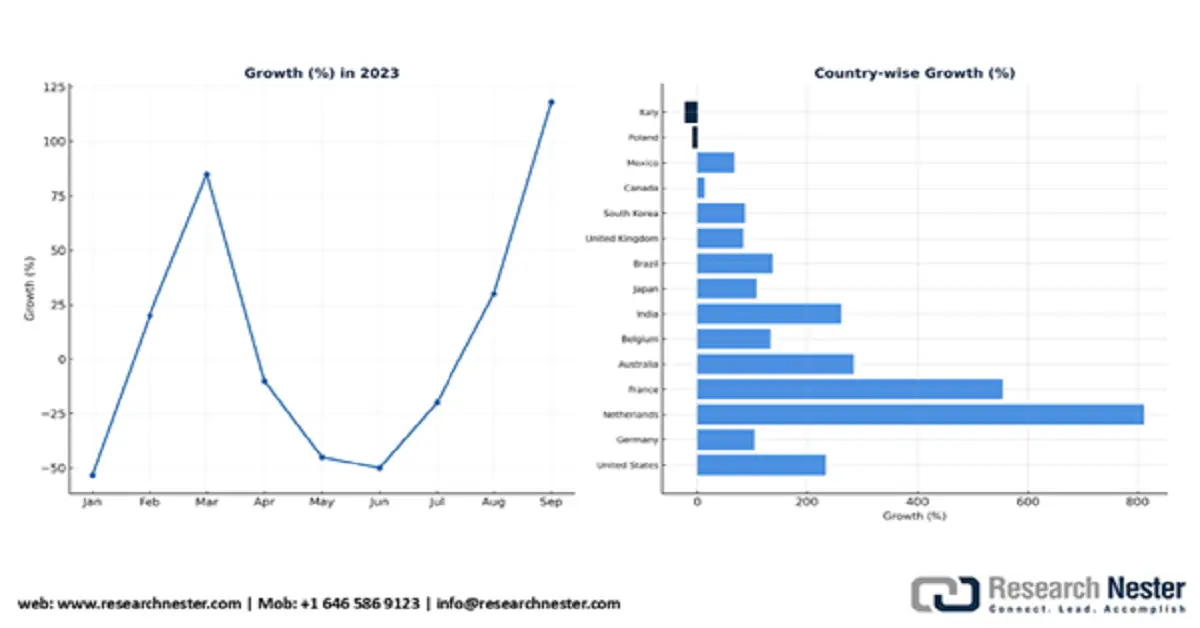 - Favorable trading climate, booming military application of drones: The military drone industry is estimated to triple by 2030. Countries are strategically fueling domestic civilian and military drone development and building widespread global trade networks for advanced systems. As of September 2023, China’s drone exports increased by 74.1% and reached USD 237 million, particularly in the remote-controlled drones segment (under 250g take-off weight), which showcased higher traction. In 2023, the worldwide drone trade was valued at USD 3.93 billion, underscoring a 60.9% surge from 2022, when the trade reached USD 2.44 billion. Drones were the 608th most traded product out of 1,228 items. In 2023, the top exporters of drones were China (USD 1.83 billion), Hong Kong (USD 408 million), and Turkey (USD 231 million), whereas the leading importers included Ukraine (USD 464 million), the U.S. (USD 423 million), and the Netherlands (USD 223 million).