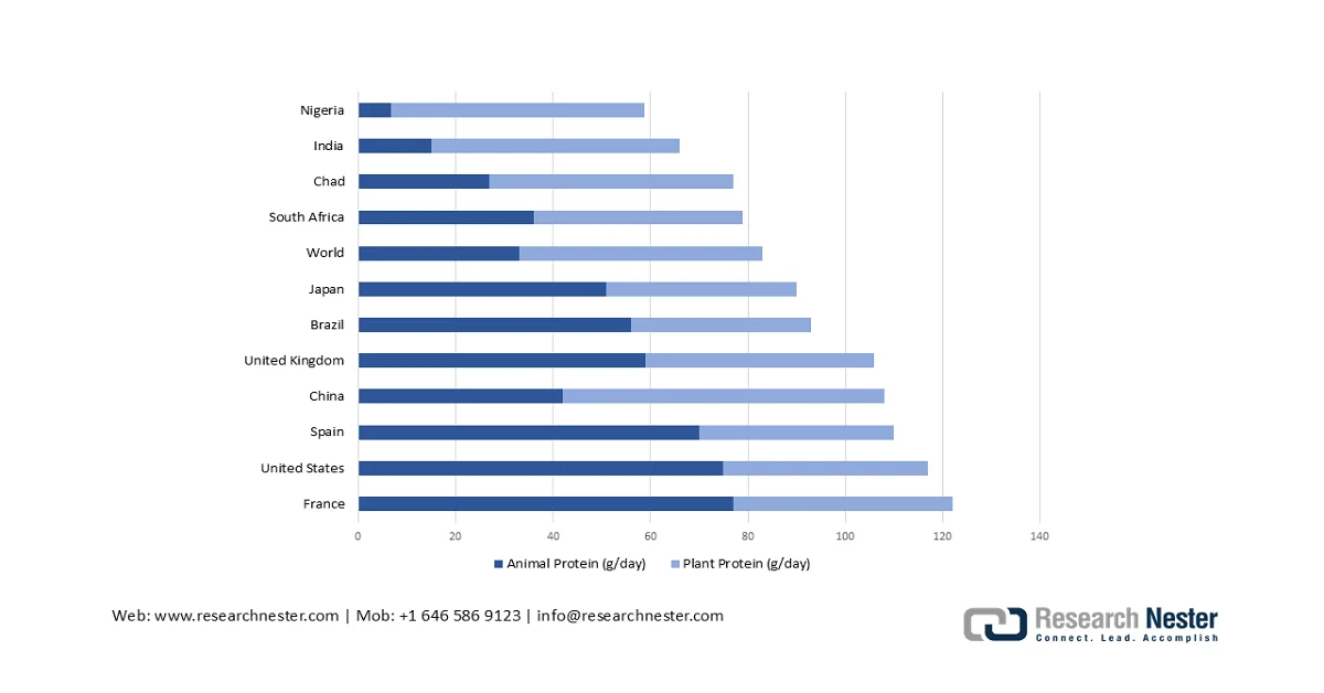 The global functional protein market is supported by the measurable shifts in public health nutrition priorities, protein intake guidance, and government-backed food innovation programs. According to the Principles of Nutritional Assessment in August 2024 most countries across Europe, North America, and Oceania, the per capita availability of protein food is greater than 100g per capita per day, reflecting the sustained structural demand across animal and plant sources. At the same time, the NLM July 2025 study shows that nearly 59% of U.S. adults are classified as obese, reinforcing the institutional focus on the high-protein dietary patterns associated with weight management and metabolic health. These policy-backed nutritional frameworks and funding programs provide long-term structural support for ingredient suppliers serving food processing, medical nutrition, and performance nutrition channels.
