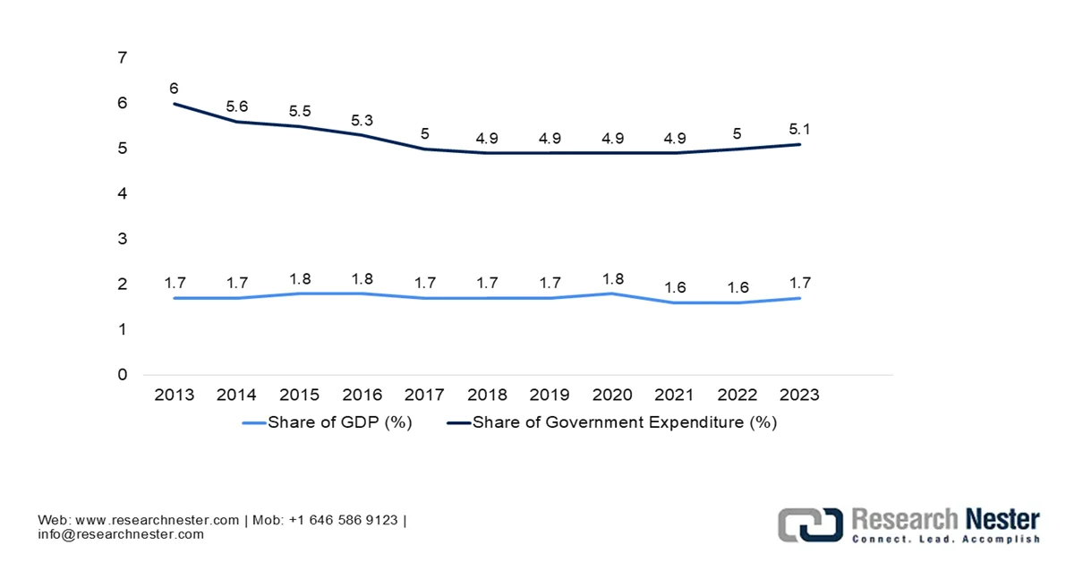The military antenna market is positioned for sustained strategic growth, which is driven by evolving defense communication systems, growing defense expenditure, modernization programs, and the increasing complexity of modern warfare environments. According to the official statistics published by Stockholm International Peace Research Institute (SIPRI) in April 2024, the global military spending increased for the ninth consecutive year in 2023, which surpassed a total value of USD 2,443 billion in 2023, marking a 6.8 per cent year-on-year rise. Meanwhile, the global military burden rose to 2.3% of world GDP, whereas the military spending as a share of total government expenditure increased by 0.4 percentage points to 6.9 per cent. On a per capita basis, world military spending reached USD 306, the highest level in the past few decades.