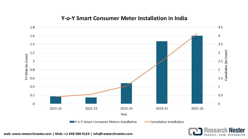 The rapid growth of the narrowband IoT market is fueled by the rising adoption of smart utility meters along with the high inclination towards low-power IoT networks across several domains. NB-IoT systems and solutions are important aspects of the modern utility meters as it enhances the functionality and efficiency of smart meters. According to the National Smart Grid Mission (NSGM), India has installed over 41 million smart consumer meters as of mid-2025, with a total number of 224 million sanctioned under the Smart Metering National Programme (SMNP) and Revamped Distribution Sector Scheme (RDSS).