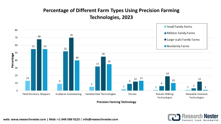 - Increasing integration of NB-IoT in smart agriculture: The rapid adoption of NB-IoT in smart agriculture is expected to fuel the market growth. The rising adoption of yield monitors, soil maps, and other precision tools is creating demand for NB-IoT connectivity to collect, transmit, and analyze real-time farm data. This shift allows smarter decision-making, enhancing productivity and resource efficiency in large-scale agricultural operations. According to a report by the U.S. Department of Agriculture 2023, yield monitors, yield maps, and soil maps were utilized on 68% of large-scale crop farms. It also states that the use of precision agriculture technologies rises significantly with farm size, while small family farms with gross cash farm income below USD 350,000 report the lowest adoption levels across all technology categories.