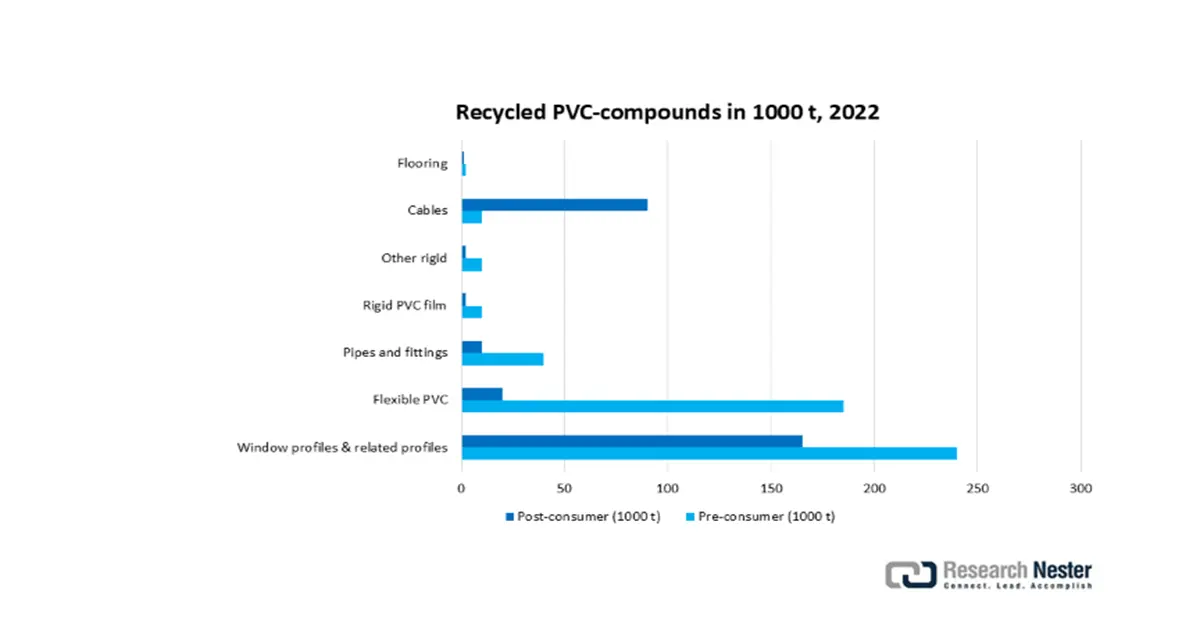 Innovation in recycling & circular economy: With increasing societal and regulatory pressure to reduce plastic waste, sector and government initiatives (such as the circular economy push from the EU) have encouraged reuse and chemical recycling of PVC. For instance, in 2022, the EU recycled 813,266 tons of PVC compounds, with window frames accounting for 56% of total post-consumer recycling. However, the presence and types of additives have a critical influence on recyclability. Demand for compatible, non-migrating types of additives, which do not interfere with material recovery, is increasing. As the industry pivots towards the formulation of recyclable PVC, the development and acceptance of new additive chemistries are emerging to ensure the principles of closed-loop recycling and minimal environmental impact are upheld.
