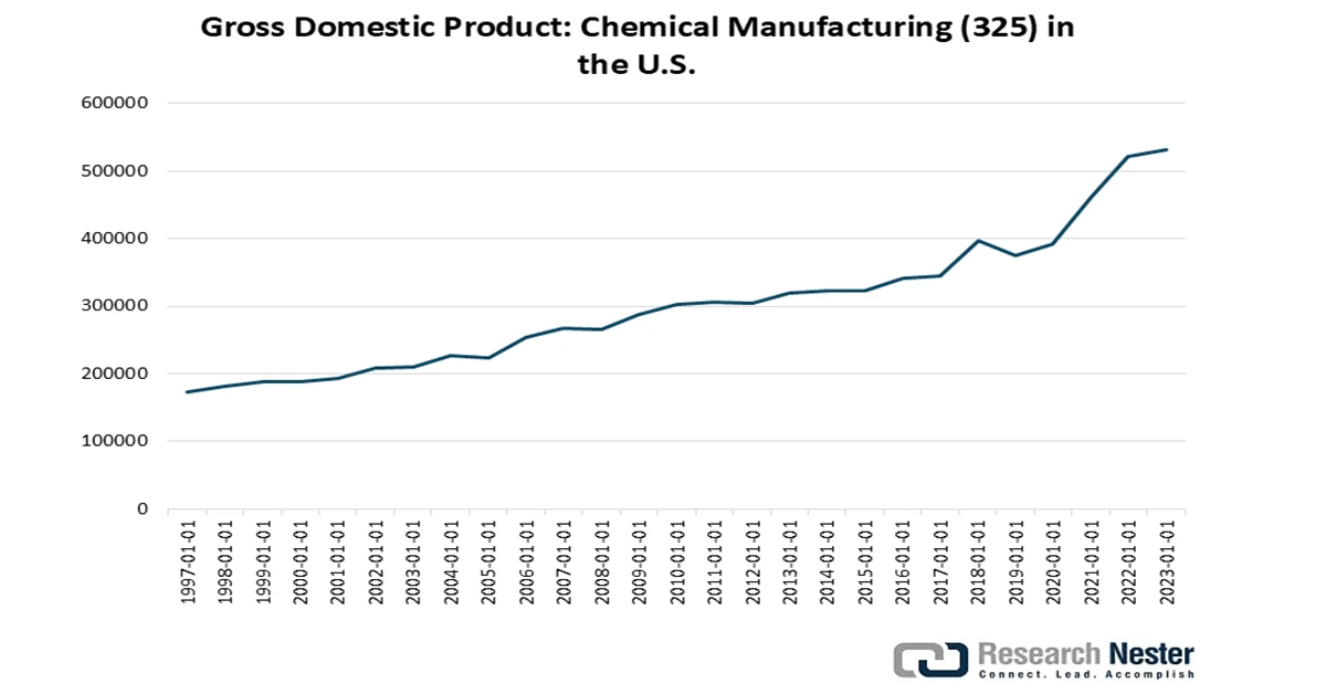 The U.S. specialty chemicals market growth is propelled by the growth in electric vehicles and lightweight materials. Also, there is a resurgence of semiconductor manufacturing in the U.S., mainly owing to support from the CHIPS Act, which has reignited the demand for ultra-high-purity specialty chemicals used in photolithography. Moreover, market forces are propelling the shift towards bio-based specialty chemicals. Producers in the country are increasingly manufacturing low-VOC formulations and eco-friendly materials in response to environmental mandates. The quantifiable outcomes of these green chemistry initiatives are demonstrable as by the year 2022, more than 133 winning green chemistry technologies in the U.S. have eradicated 830 million pounds of hazardous chemicals and solvents annually. This illustrates the industry’s transition to environmentally compliant and sustainable production pathways. Such progress reinforces sustainability as a key structural growth driver for the U.S. specialty chemicals market. According to the analysis by the American Chemistry Council (ACC), the U.S. chemical demand is expected to increase at a growth rate of 15.5% by 2033. This highlights that investing in the U.S. is likely to double the revenues of specialty chemical producers. The green chemistry trends are also expected to drive the overall market growth in the coming years.